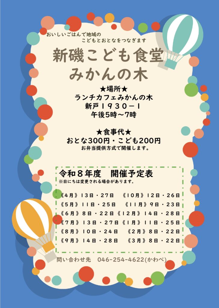 ☆次回、4/27(月)・5/11(月)・5/25(月)に開催!今後の予定は下記チラシをご覧ください♪【開催日時】原則第2・4月曜日 17:00~19:00 【開催場所】ランチカフェみかんの木(南区新戸1930-1) 【参加費等】高校生まで200円 大人300円 【連絡先】046-254-4622 【担当者】川邉(かわべ) ◆運営者からのメッセージ おいしいごはんで地域のこどもとおとなをつなぎます!現在、コロナウィルス感染症対策のため、お弁当提供方式で開催します。完全予約制です。ボランティアスタッフも募集中。よろしくお願いします!