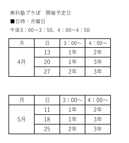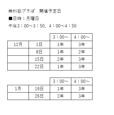 ◆2025年(令和7年度)…1年、2年、3年のクラスあり。時間は日にちにより変更します。予定表をしっかり確認してください。