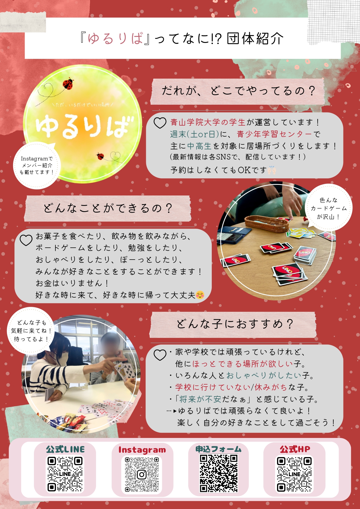 私たちは、中高生の居場所づくりを目的に、月2回土曜日または日曜日 14:00~17:00の間、相模原市にある″青少年学習センター″で、活動を行います!