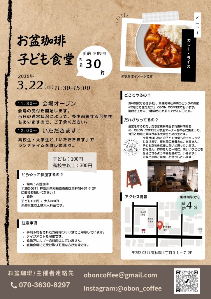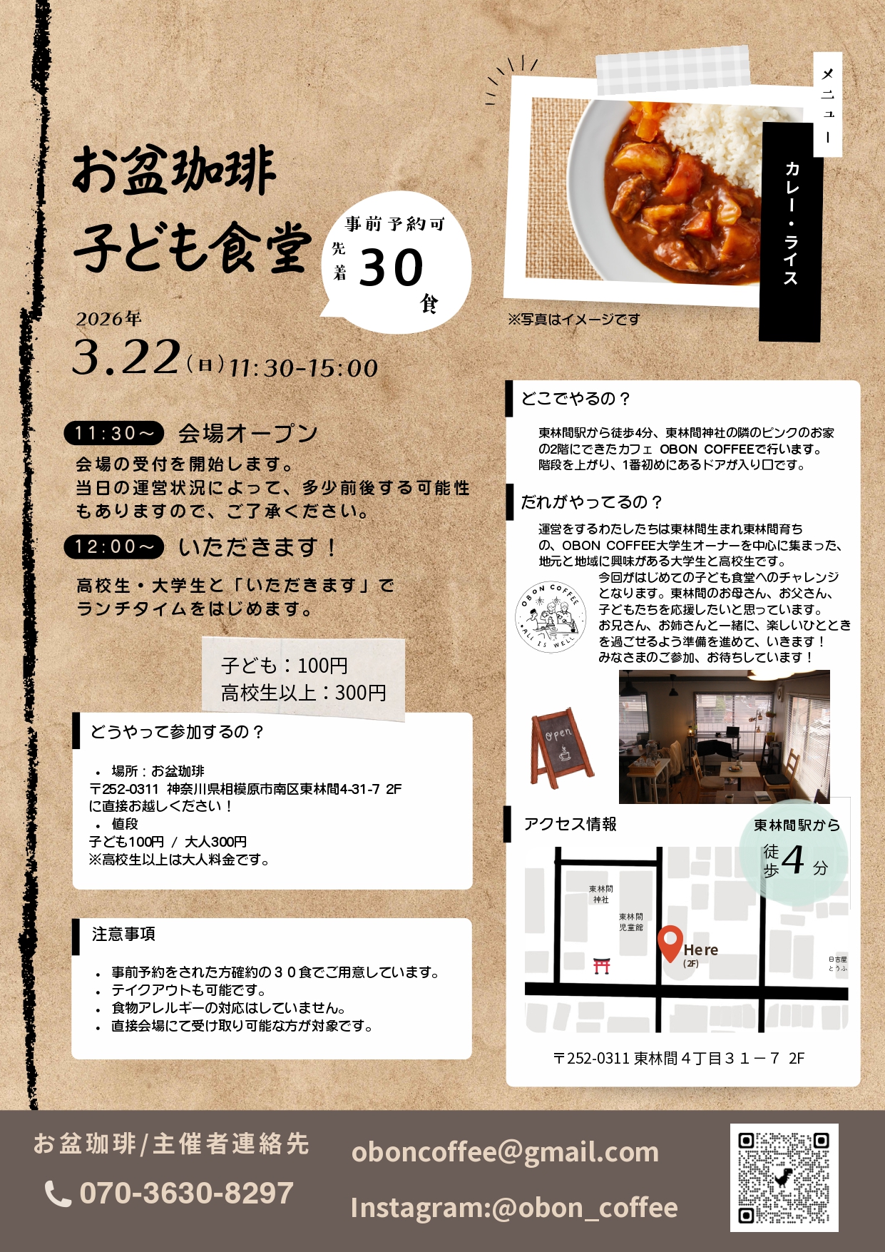 現役高校生・大学生が運営する子ども食堂! 東林間駅徒歩4分の場所にある、お盆珈琲というカフェで開催します。 子どもたちと、現役学生が食を通じて関わりあえる場を作りたいとの思いで立ち上げました。 手探りで活動しておりますので、ぜひ温かいご支援のほどよろしくお願いいたします!