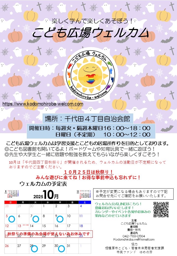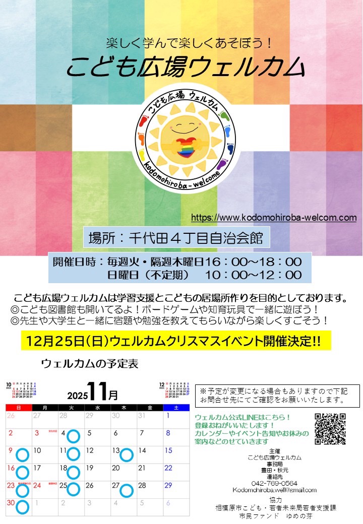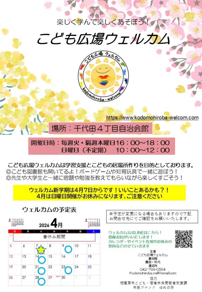 「こども広場ウェルカム」は学習支援とこどもの居場所作りを目的としています。先生や大学生と一緒に宿題や勉強を教えてもらいながら楽しく過ごそう!ボードゲームや知育玩具もあるよ♪活動は毎週火曜日・隔週木曜日16:00〜18:00、日曜日(不定期)10:00-12:00@千代田4丁目自治会館です!参加希望の場合は、お電話またはメールにて申込みをお願いします。