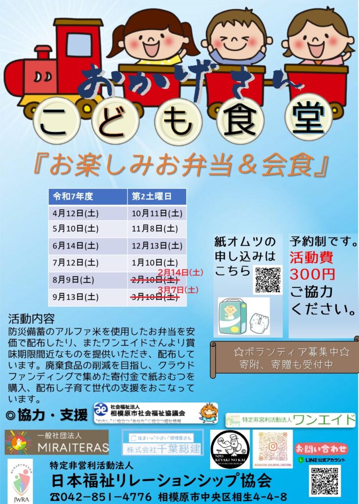 防災備蓄のアルファ米を使用したお弁当を安価で配布したり、またワンエイドさんより賞味期限間近なものを提供いただき、配布しています。廃棄食品の削減を目指し、クラウドファンディングで集めた寄付金で紙おむつを購入、配布し子育て世代の支援をおこなっています。ご寄付、募金、ボランティアの募集をしております。どうぞよろしくお願いいたします。