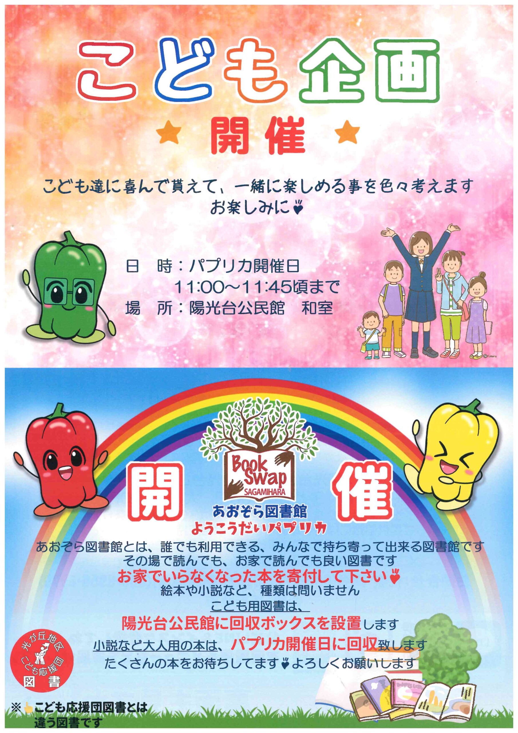★R7年3月からあおぞら図書館を開設しています♪あおぞら図書館とはみんなで作っていく図書館です。ご自宅に眠っている本を募集中です。絵本や小説など、種類は問いません。陽光台公民館に回収ボックスを設置しますのでぜひご協力をお願いします!