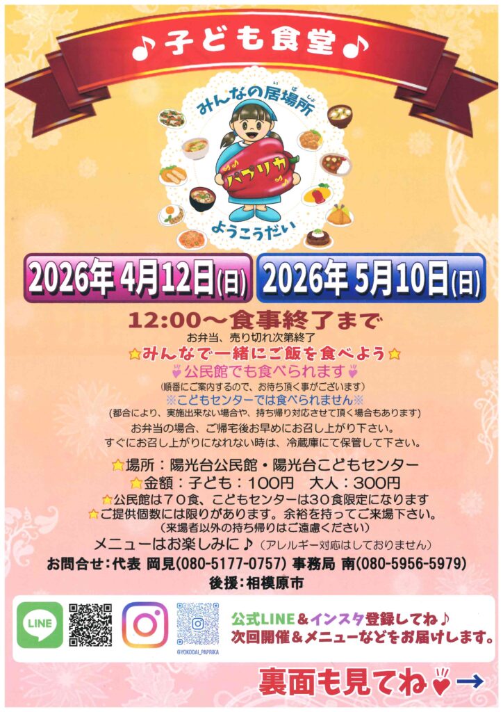 R7年3月より公民館で食べる事ができるようになりました!感染防止のため順番にご案内するので、お待ちいただくことがございます。(こどもセンターでは食べられません)お弁当の場合、ご帰宅後お早めにお召し上がりください。すぐにお召し上がりになれない時は、冷蔵庫にて保管してください。お弁当は、陽光台公民館70食、陽光台こどもセンター30食をご用意しています。売り切れ次第終了。アレルギー対応はしておりません。来場者以外の持ち帰りはご遠慮ください。