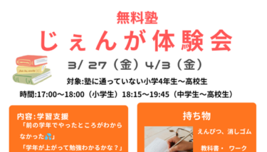 ☆3/27(金)、4/3(金)に体験会を行います!星が丘地区で新たに無料塾を開きます。詳しくは下記チラシをご確認ください。☆4/10(金)本オープン予定です。 【開催日時】毎週金曜日 17:00~18 […]