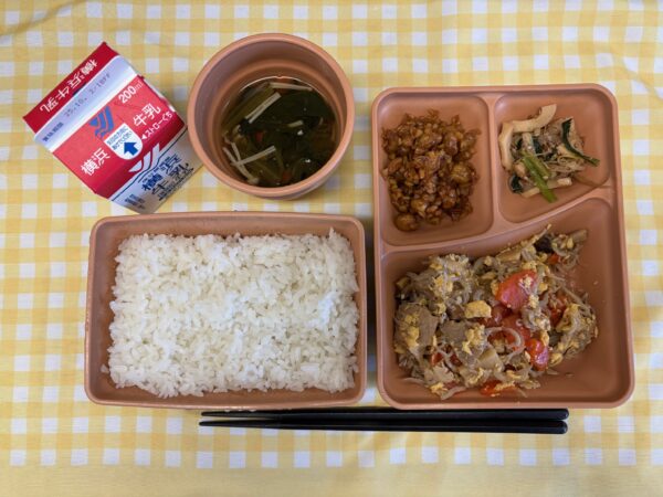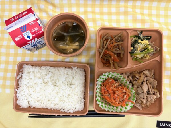 献立は、ごはん、豚の生姜焼き、にんじんしりしり、小松菜とベーコンの卵炒め、きんぴらごぼう、もやしとわかめのみそ汁、牛乳です。