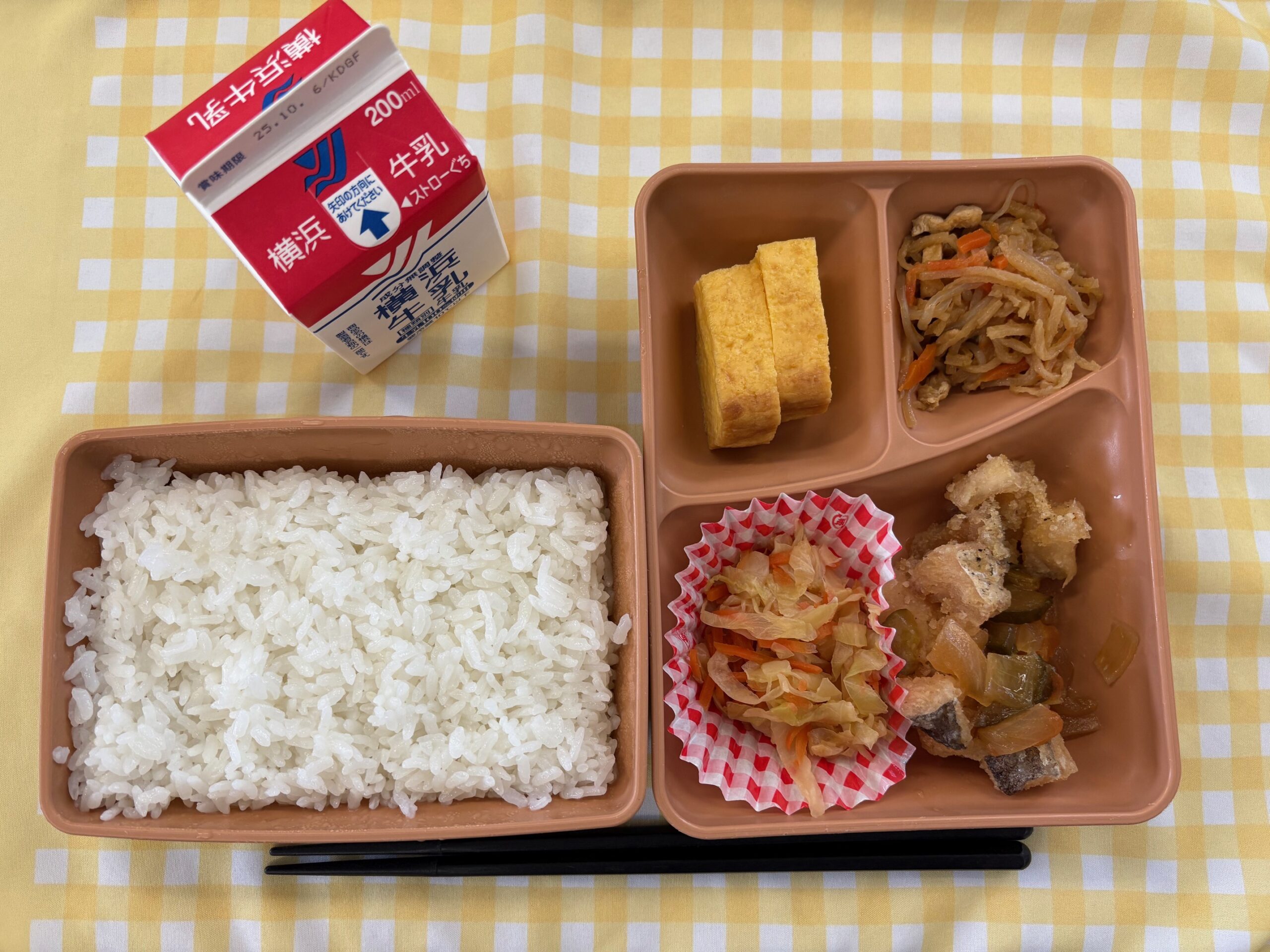 今日の給食は、ごはん、メルルーサのマリネ、野菜の浅漬け、切干大根の炒め煮、厚焼き卵、牛乳です。