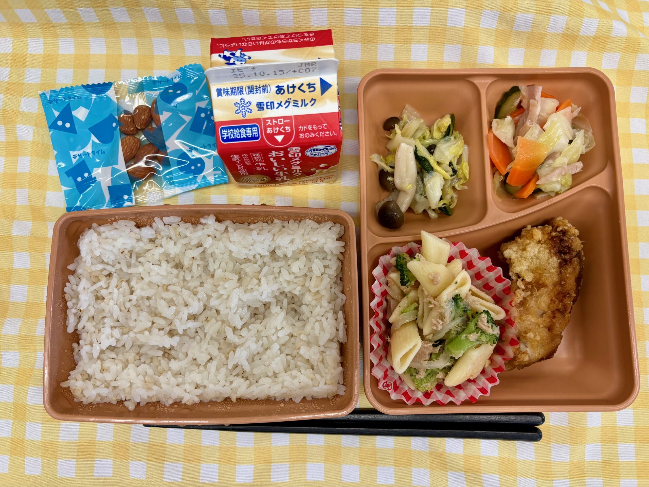 今日の給食は、麦ごはん、牛乳、ほっけの竜田揚げ、ブロッコリーとツナのペンネ、レモンドレッシングサラダ、白菜ときのこのソテー、小袋アーモンドです。