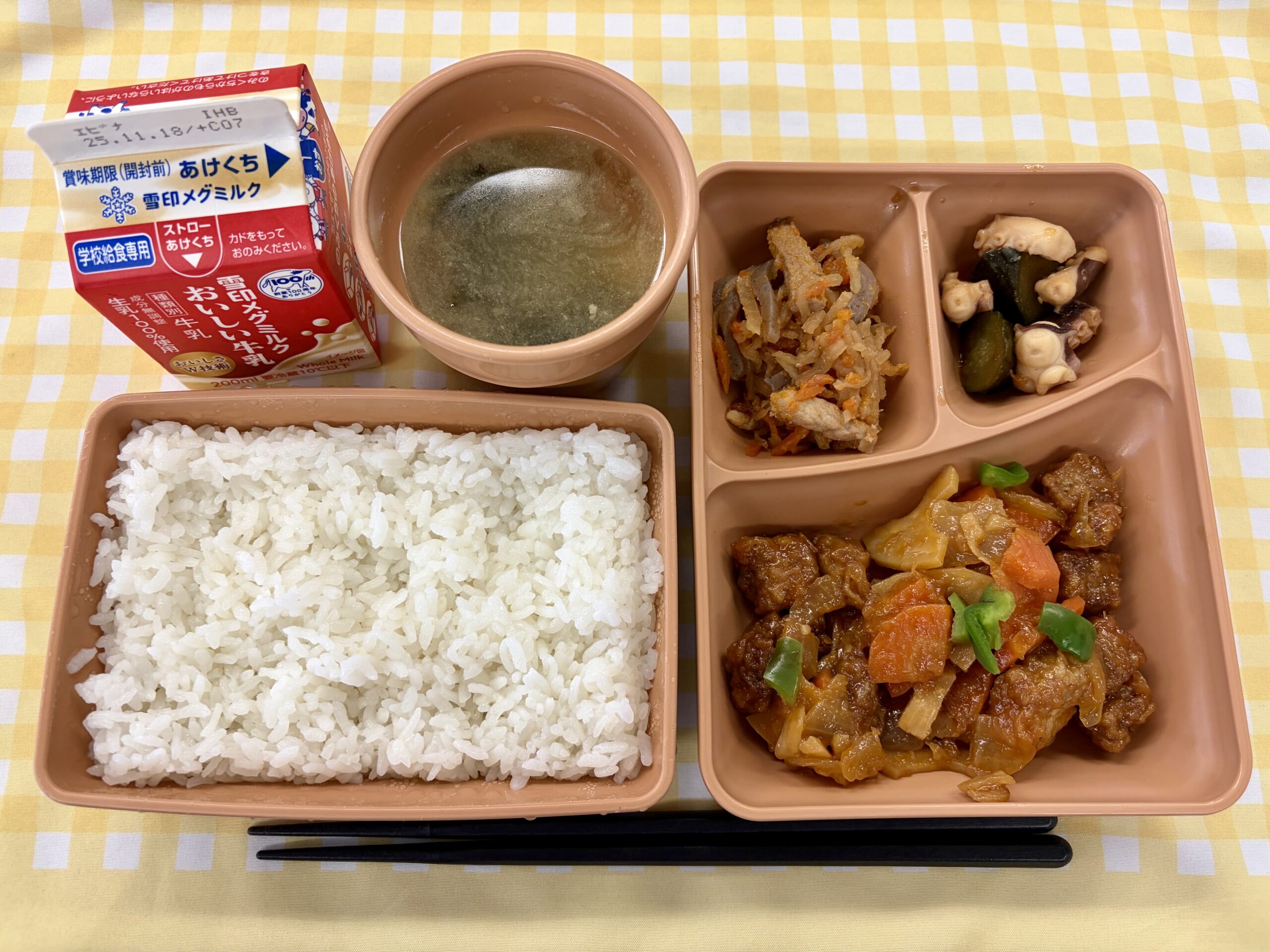 今日の給食は、ごはん、黒酢de酢豚、たこときゅうりの中華あえ、切干大根のピり辛炒め、わかめスープ、牛乳です。