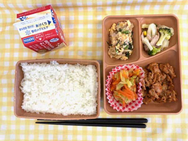 今日の給食は、麦ごはん、牛乳、白身魚のバター醬油ソース、ブロッコリーのソテー、ジャーマンポテト、ささみサラダ、野菜スープです。