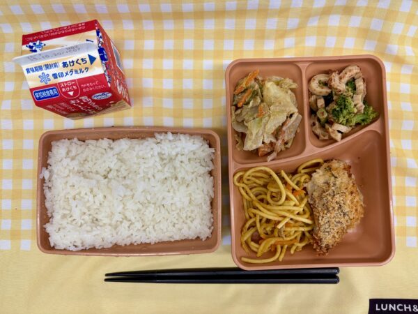 今日の給食は、ごはん、かれいのパン粉焼き、カレースパゲッティ、ブロッコリーのマヨおかか、ごまドレッシングサラダ、牛乳です。
