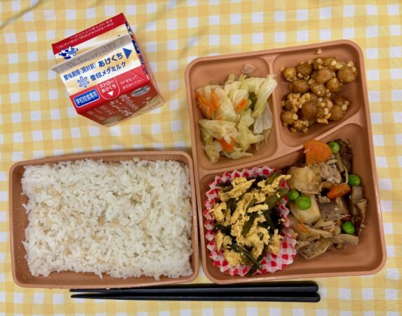 今日の給食は、玄米ごはん、筑前煮、わかめと卵の炒め物、みそアーモンド豆、和風サラダです。