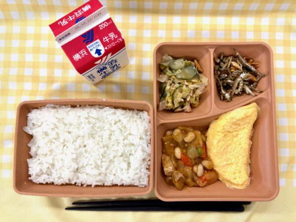 今日の給食は、ごはん、ポークビーンズ、プレーンオムレツ、いりことアーモンドの甘辛和え、コールスロー、牛乳です。
