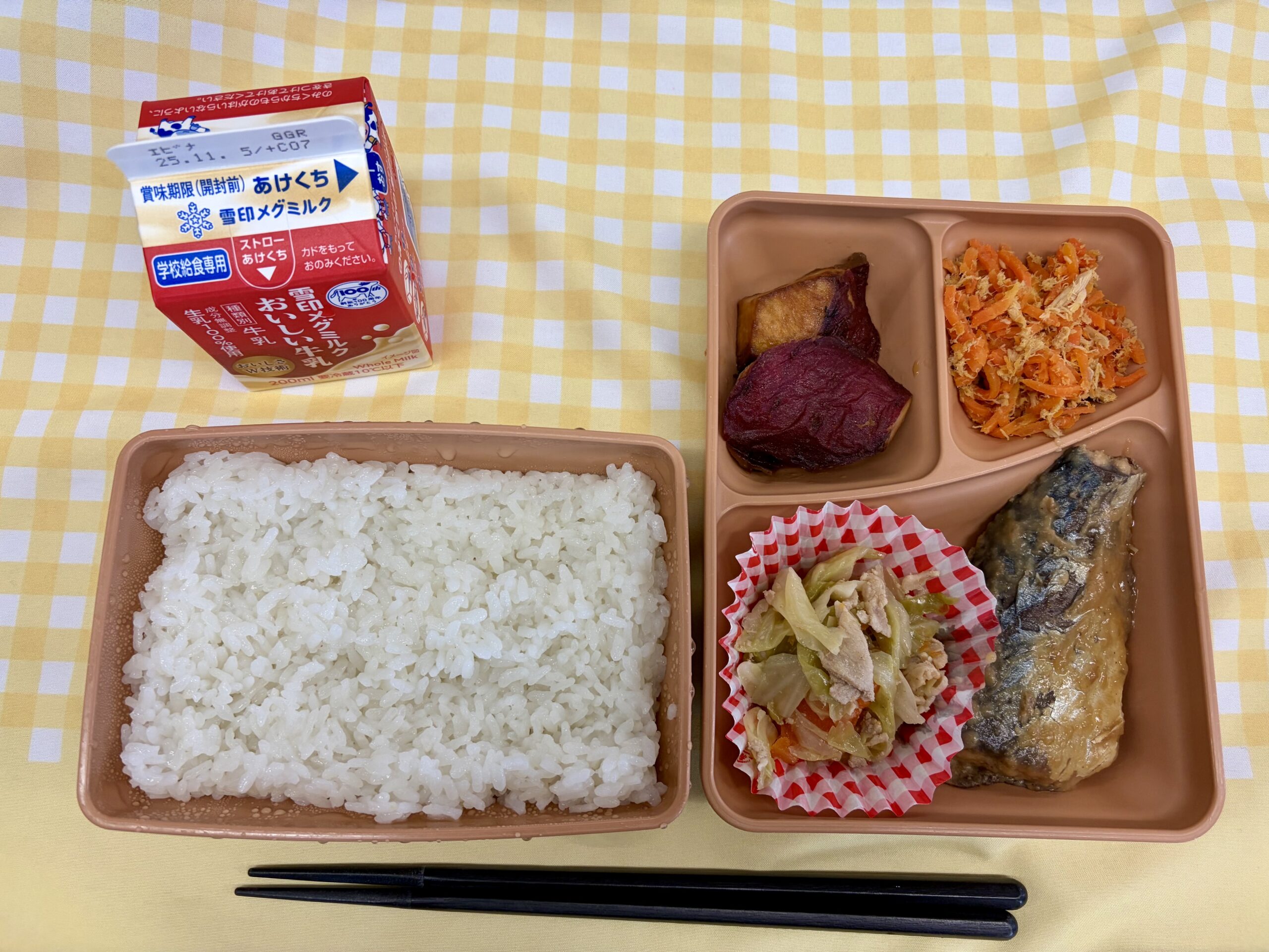 今日の給食は、ごはん、さばのみそ煮、野菜炒め、にんじんしりしり、さつま芋のレモン煮、牛乳です。