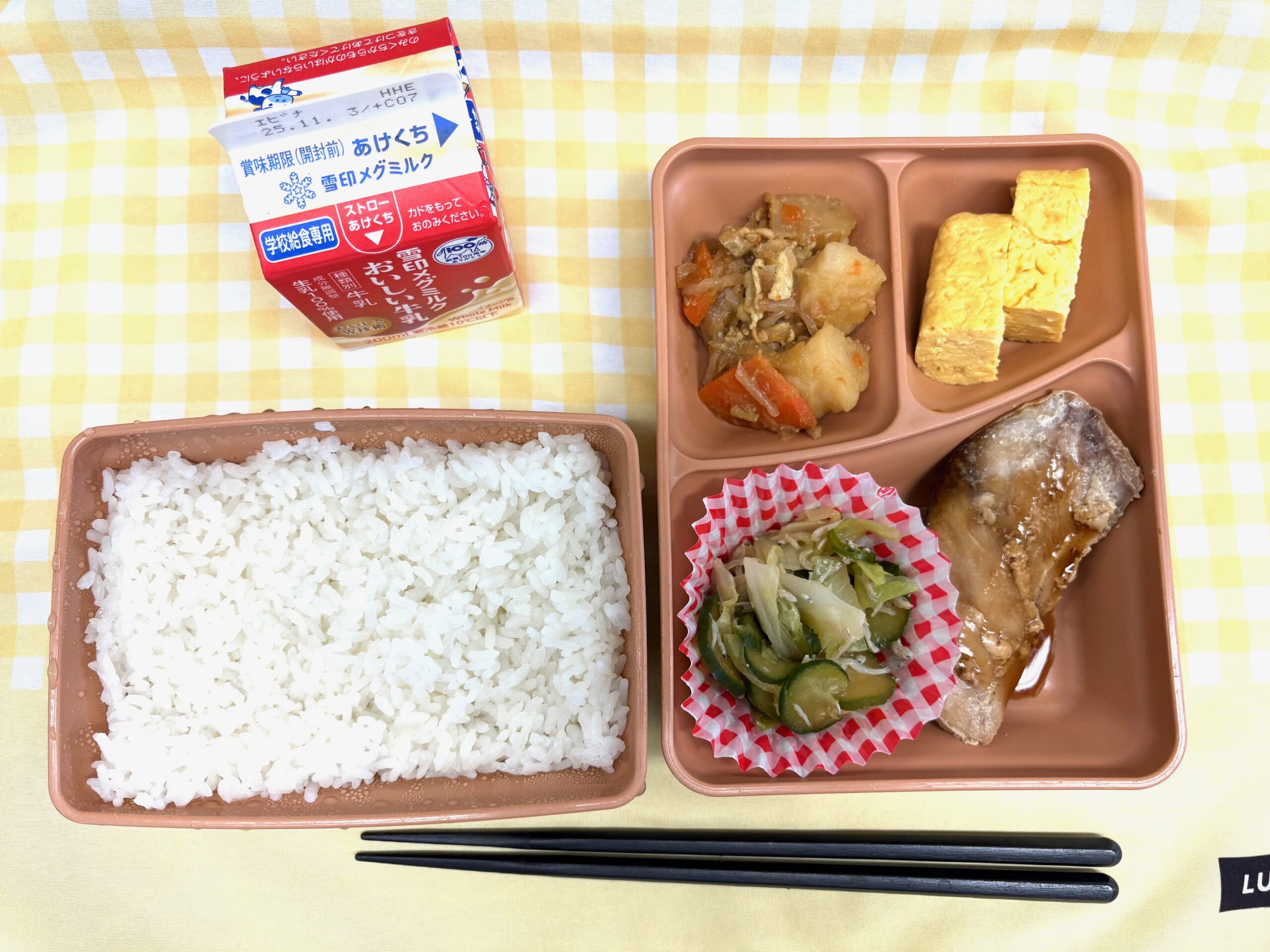 今日の給食は、上鶴間中学校3年生高嶋さん提案『~私が思うカラフル給食!!!!~』が登場です。 献立は、ごはん、豆腐ハンバーグ、ピーマンのナムル、きんぴら、ジャーマンポテト、フルーツポンチです。