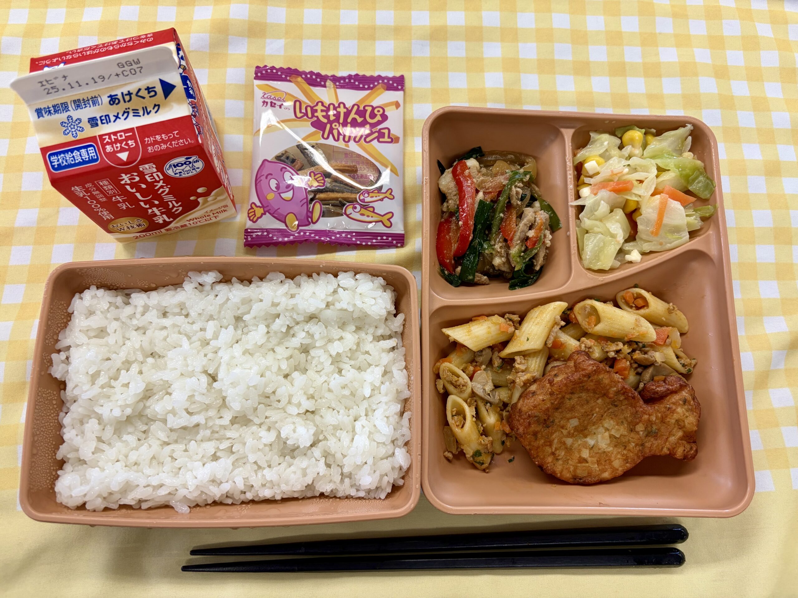 今日の給食は、ごはん、お魚ポテト、ミートソースペンネ、コーンサラダ、プルコギ、味付煮干し&さつまいも、牛乳です。