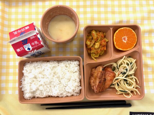 今日の給食は、ごはん、ペリペリチキン、ツナと青菜のペペロンチーノ、チャカラカ、南アフリカのコーンスープ、みかん、牛乳です。