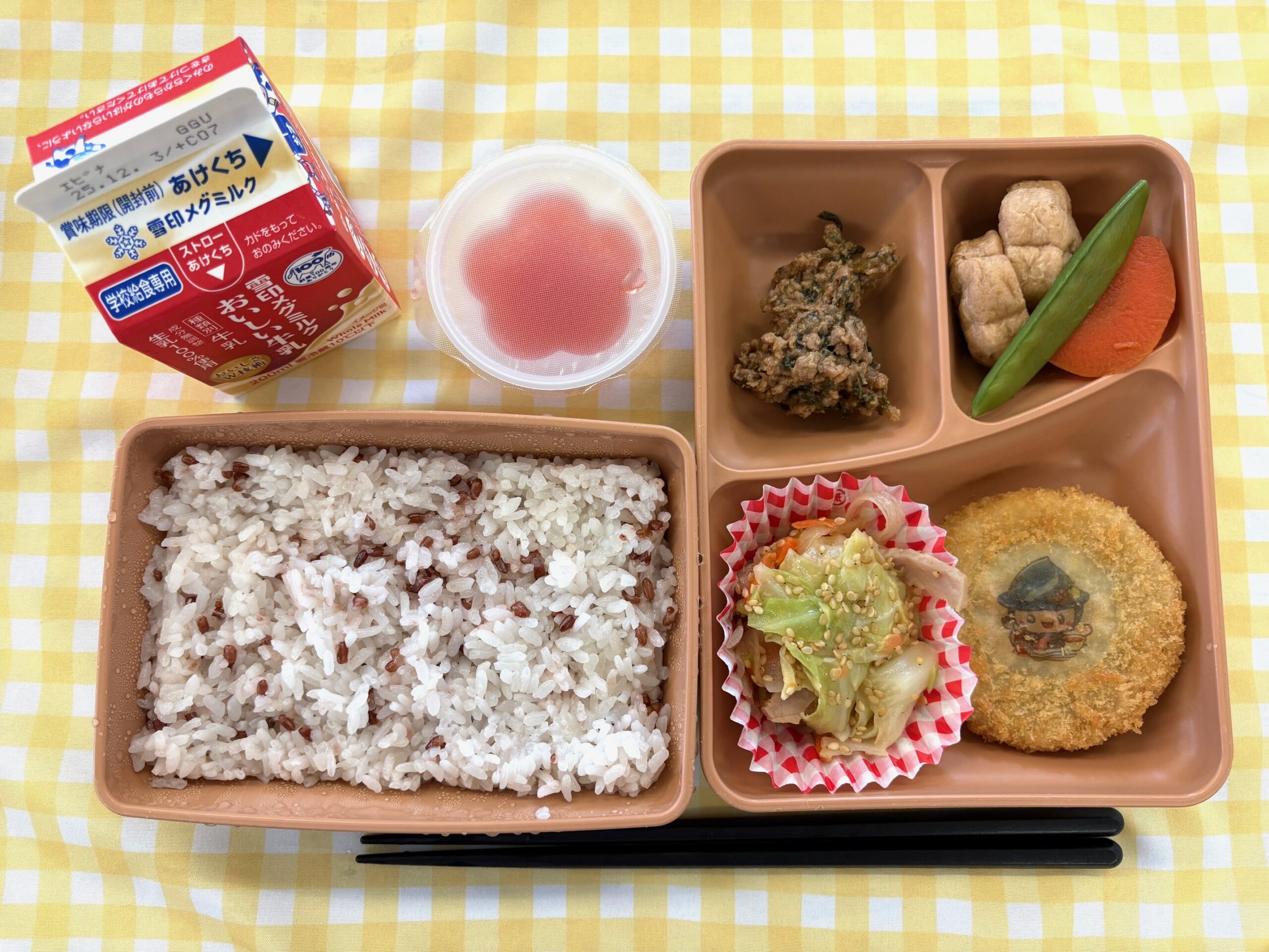 今日の給食は、赤米ごはん、お祝いコロッケ、ごまドレッシングサラダ、花がんもの煮つけ、さがみなの肉みそ炒め、いちご&ミルクぜりー、牛乳です。