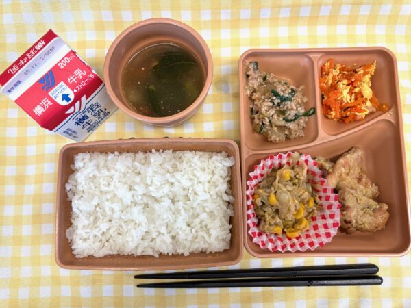 今日の給食は、ごはん、 鶏肉のスパイス焼き、玄米サラダ、にんじんとねぎの卵炒め、麻婆大根、ひよこ豆のスープ、牛乳です。