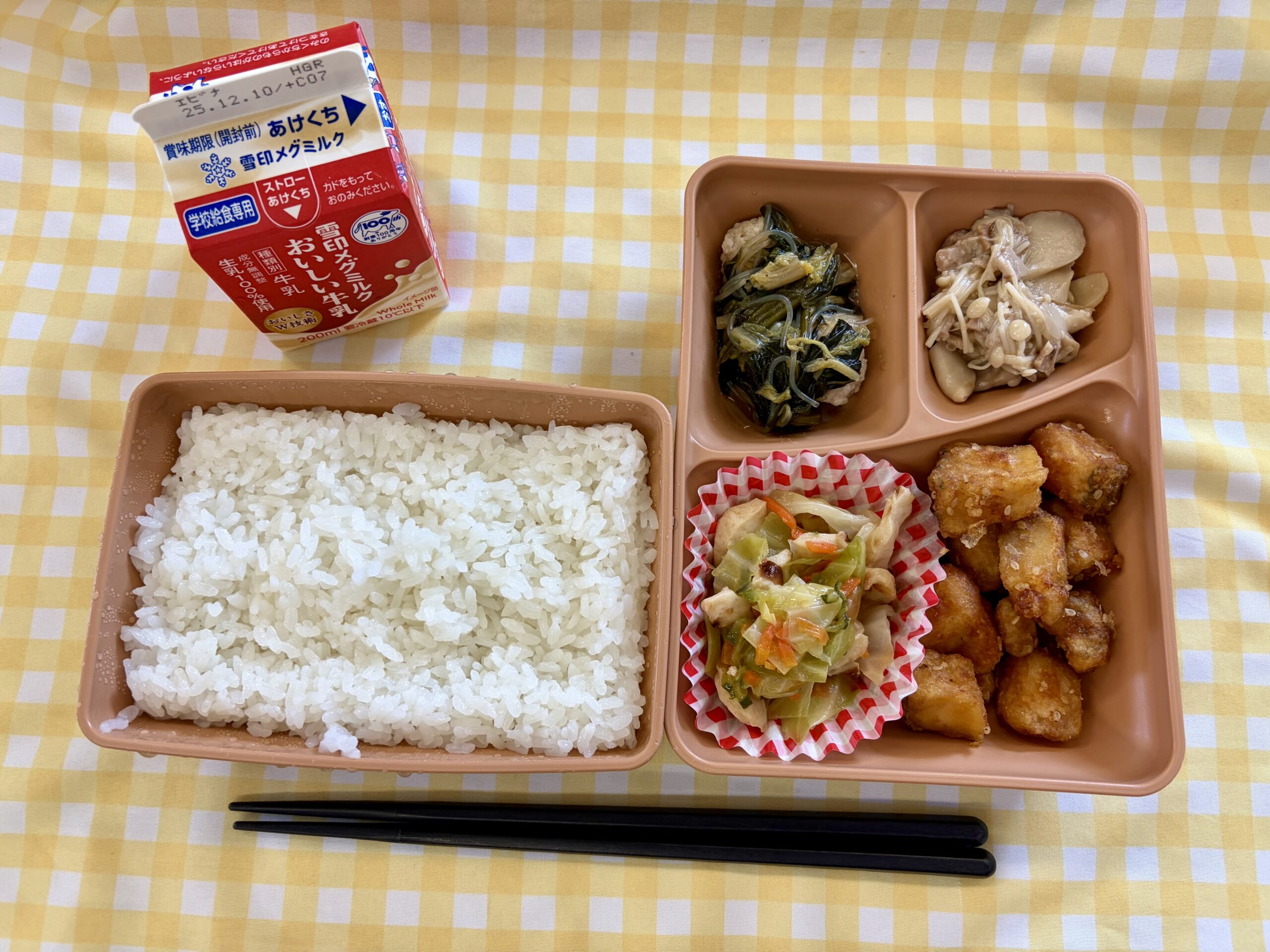 今日の給食は、ごはん、大豆とホキの甘辛あえ、和風サラダ、きのこのソテー、白菜と肉団子の煮込み、牛乳です。 きのこのソテーはエリンギ、えのきだけが入っています。きのこにはおなかの中をきれいにする働きのある食物繊維や、カルシウムの吸収を助けて、骨や歯を丈夫にしてくれるビタミンDがたくさん含まれています。秋の味覚をおいしく味わいましょう。