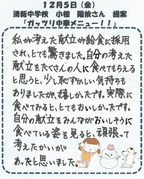 今日の給食も、おいしく楽しく、なるべく残さず食べましょう。