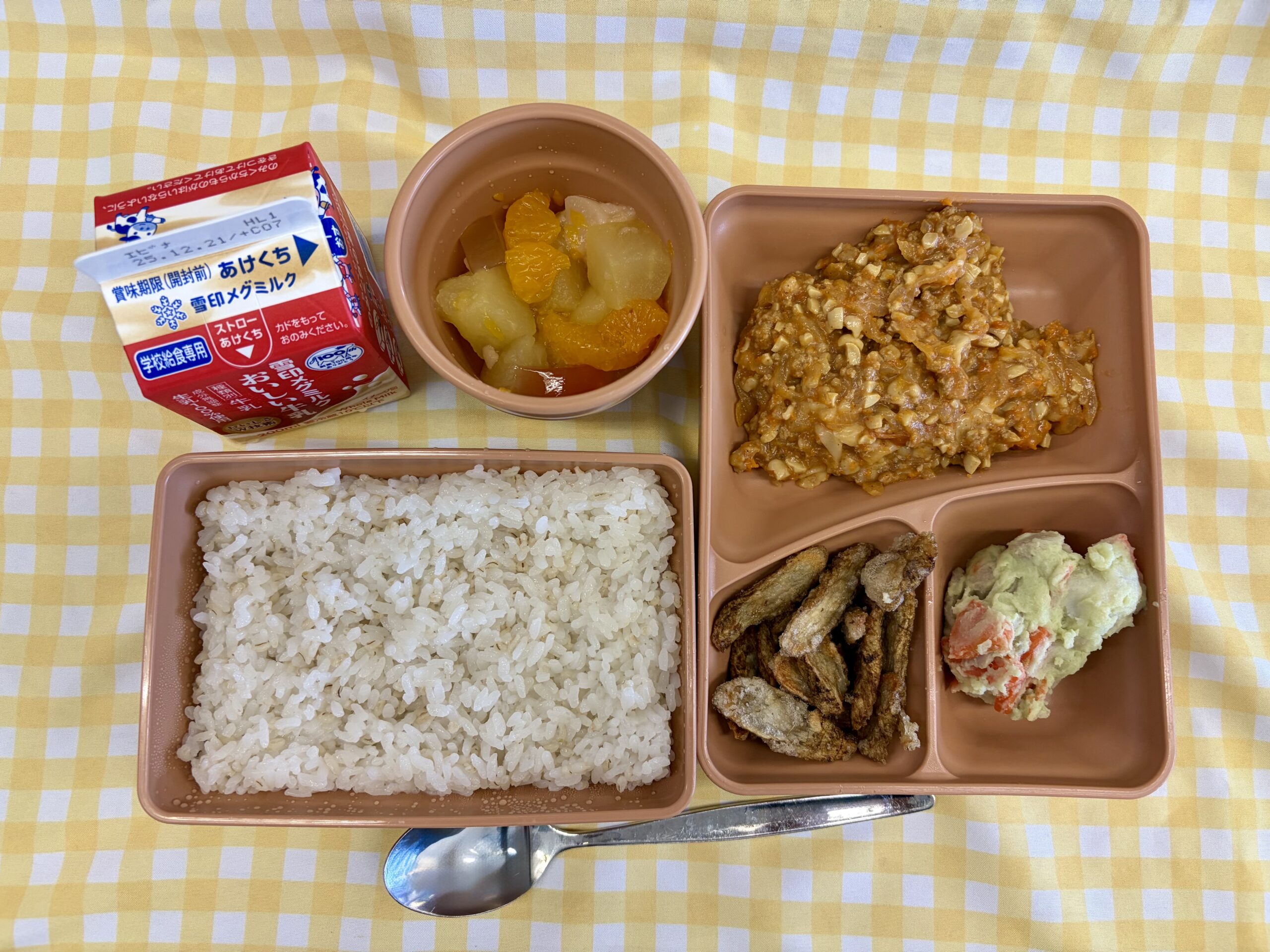 今日の給食は、麦ごはん、タコライス、ごぼうチップス、かわりポテトサラダ、フルーツジュレ、牛乳です。