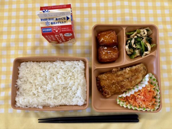 今日の給食は、ごはん、あじの竜田揚げ、にんじんしりしり、白菜と油揚げの和え物、お魚豆腐のピリ辛焼き、牛乳です。