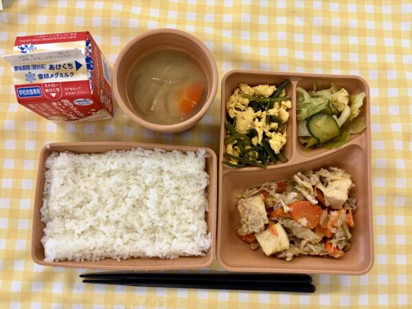 今日の給食は、ごはん、すき焼き煮、浅漬け、茎わかめと卵の炒め物、相性汁、牛乳です。