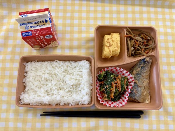 今日の給食は、ごはん、さばのみそ煮、小松菜とにんじんのごま和え、きんぴらごぼう、だし巻きたまご、牛乳です。