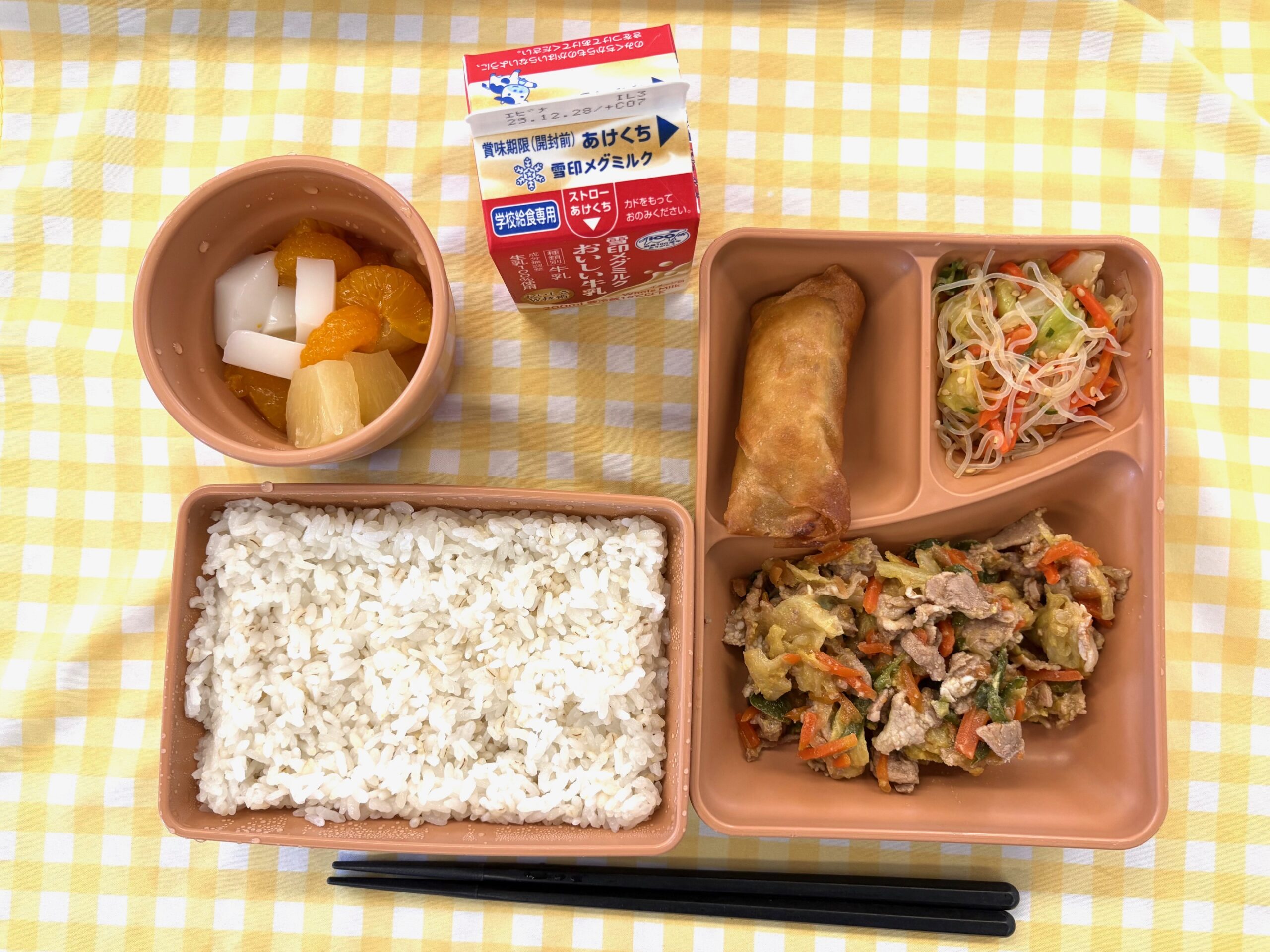 今日の給食は、麦ごはん、ホイコーロー、春巻き、中華風酢の物、杏仁豆腐、牛乳です。