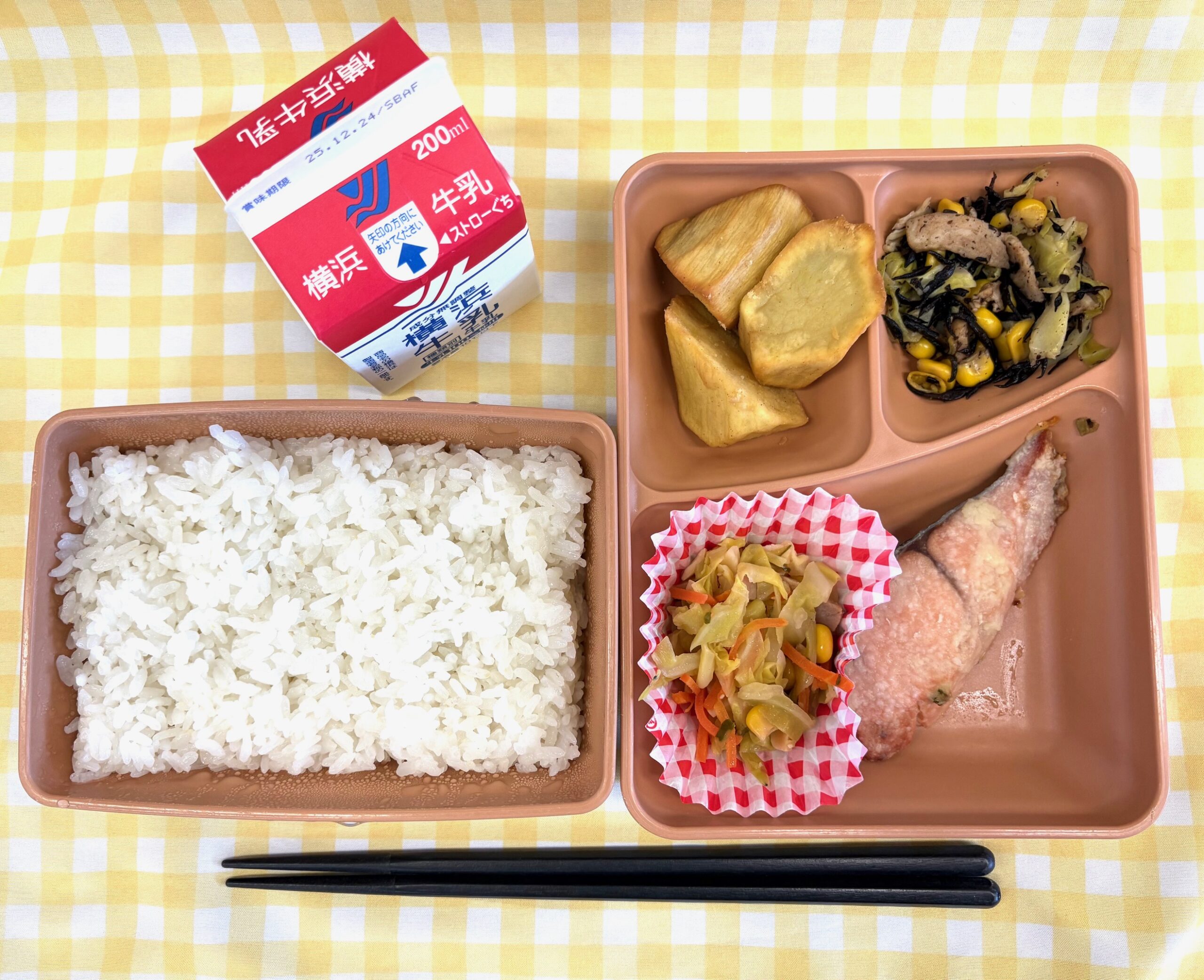 今日の献立は、ごはん、鮭のムニエル、アーモンドサラダ、ひじきのソテー、ハニーシナモンポテト、牛乳です。