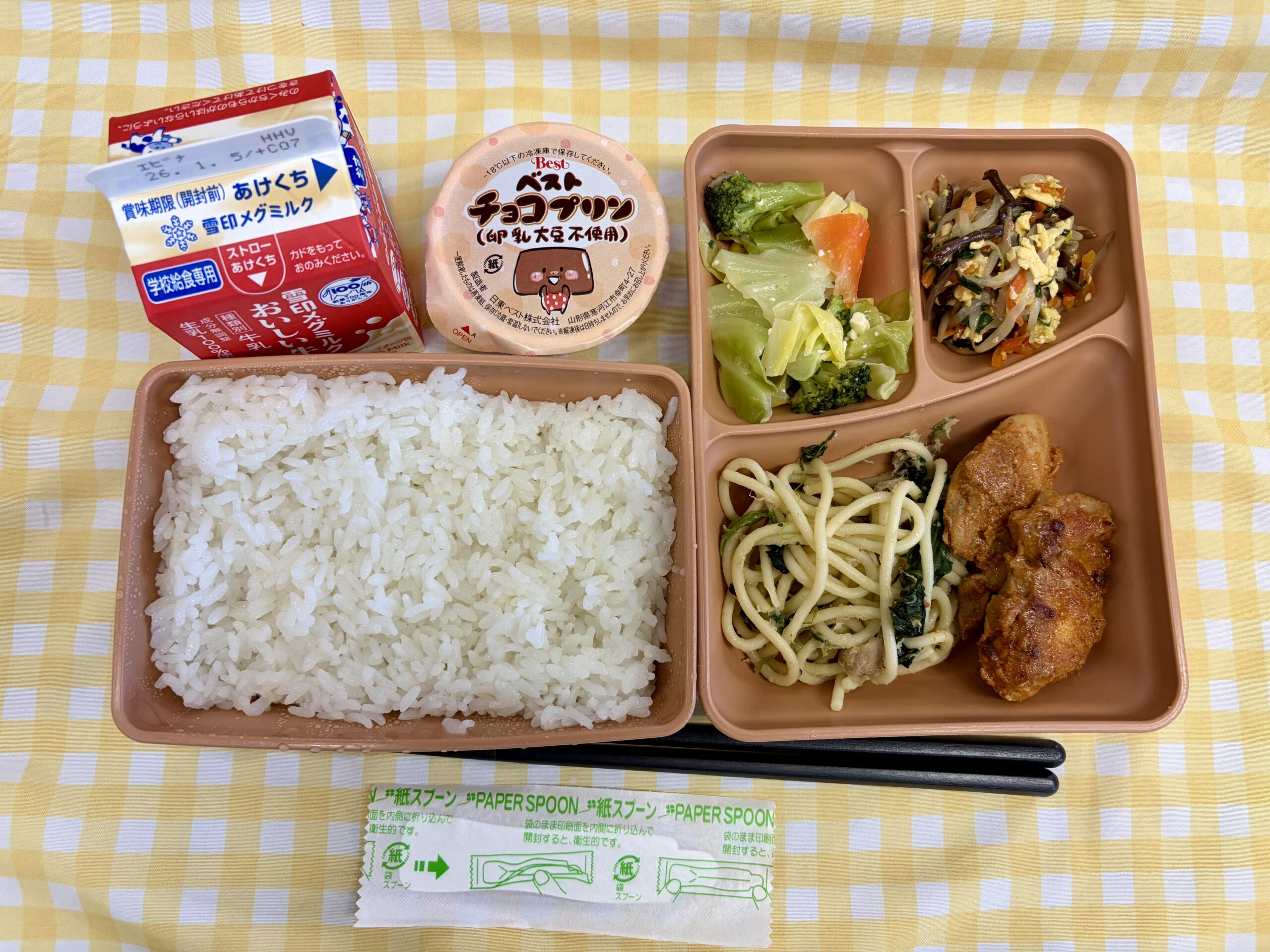 今日の給食は、ごはん、タンドリーチキン、ツナと青菜のペペロンチーノ、もやしの卵炒め、彩り野菜のチーズサラダ、チョコプリン、牛乳です。