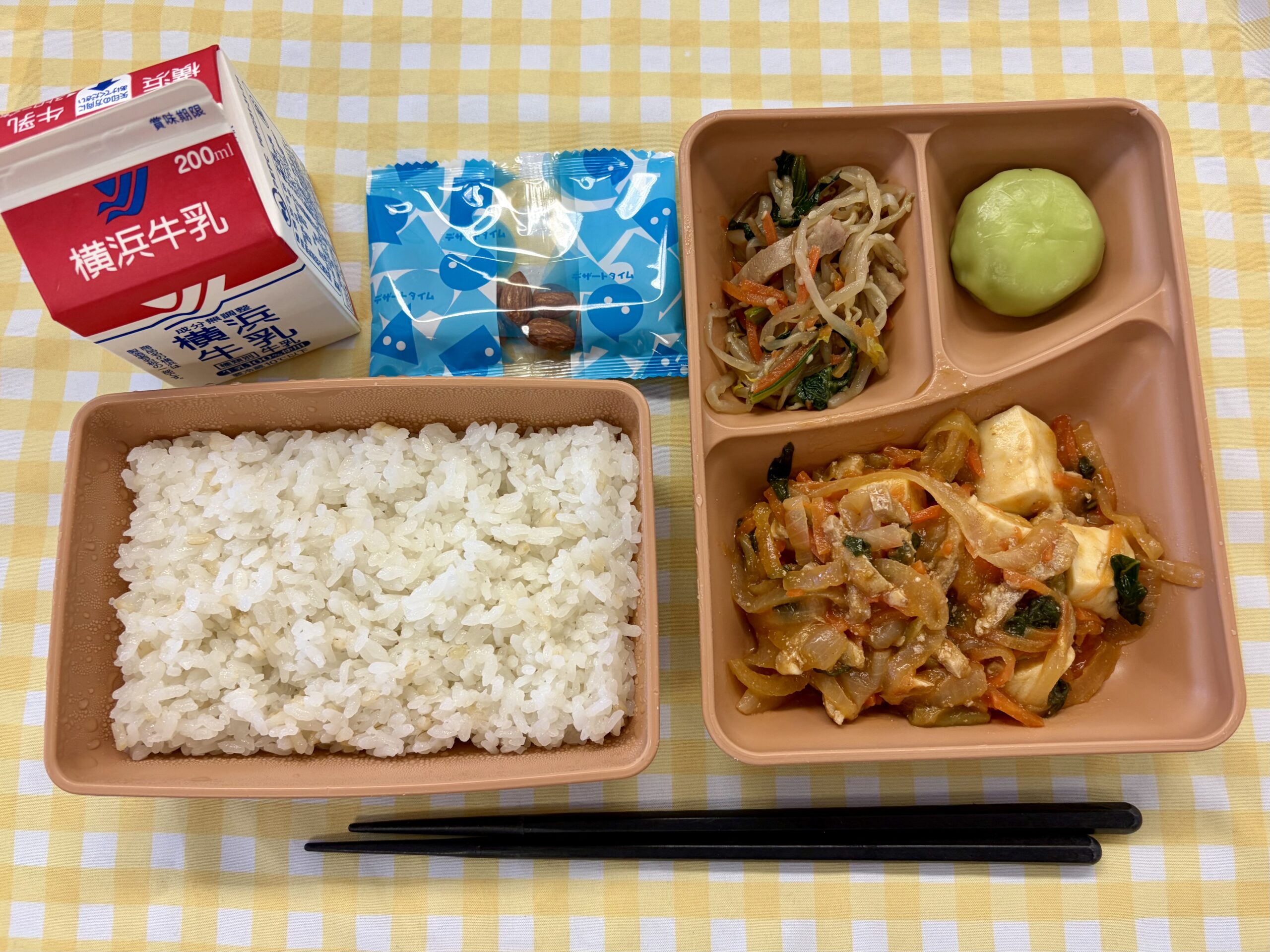 今日の給食は、玄米ごはん、四川豆腐、ナムル、ほうれんそうまん、小袋アーモンド、牛乳です。