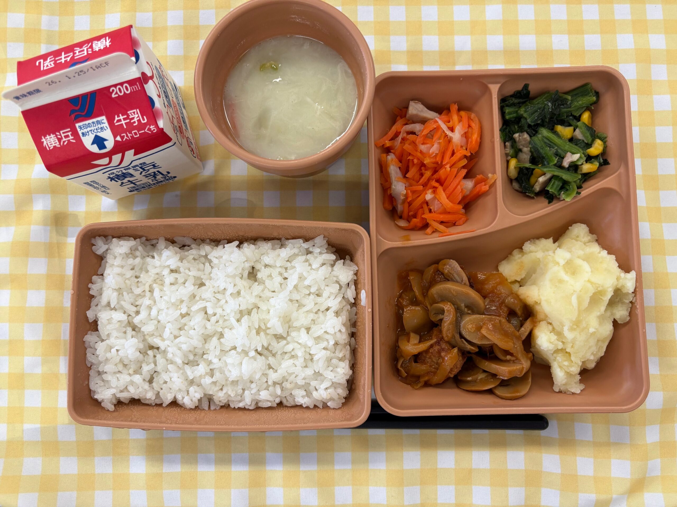 毎月19日は、食育の日で、今月の世界の料理は、【フィンランド】です。献立は、麦ごはん、肉団子のトマトソース、マッシュポテト、ほうれん草とコーンのソテー、にんじんラペ、ロイ・ケイット、牛乳です。