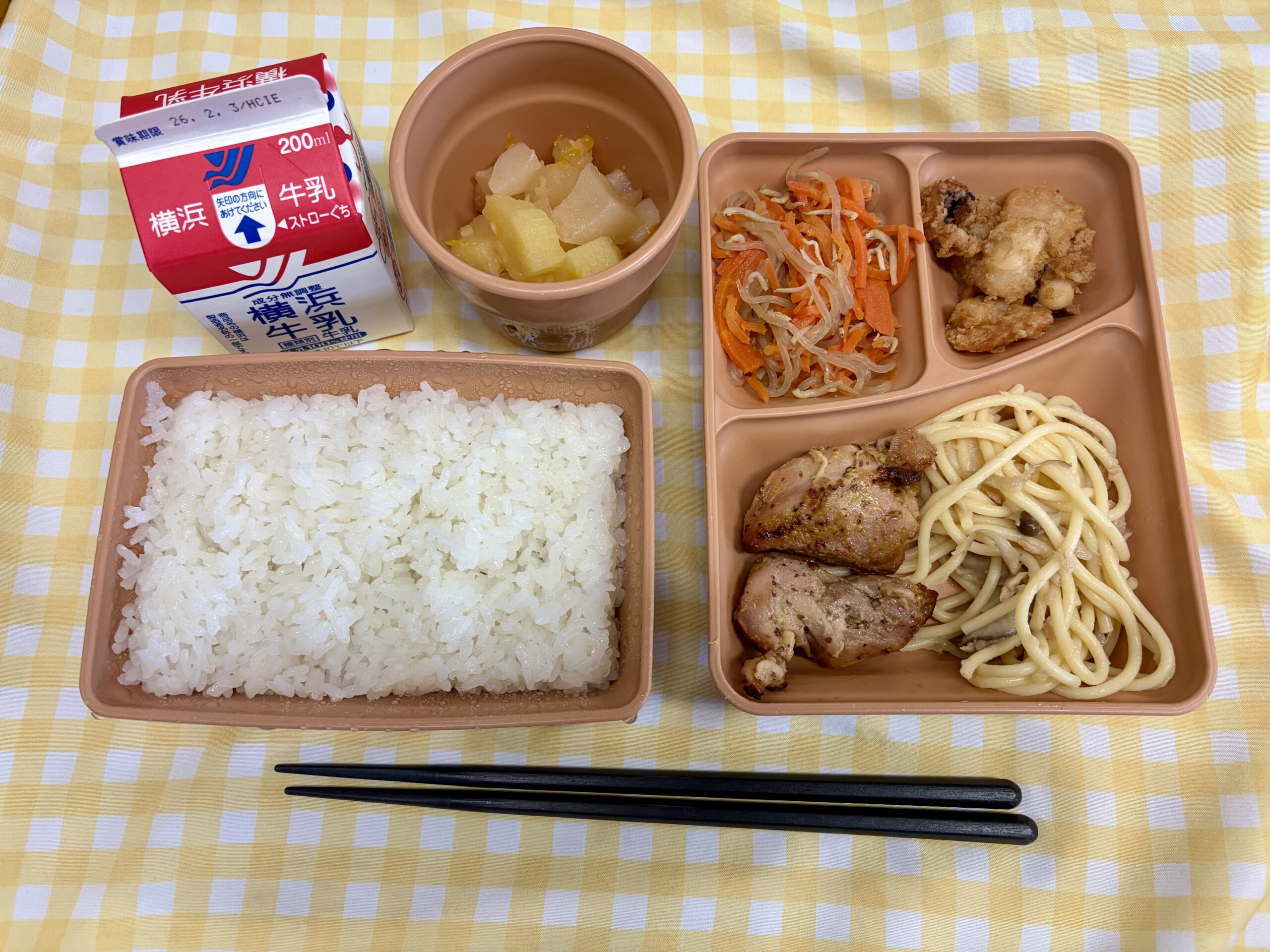 今日の給食は、ごはん、鶏肉のマスタード焼き、きのことツナの和風スパゲティ、にんじんじゃこサラダ、たことえびのから揚げ、フルーツ和え、牛乳です。