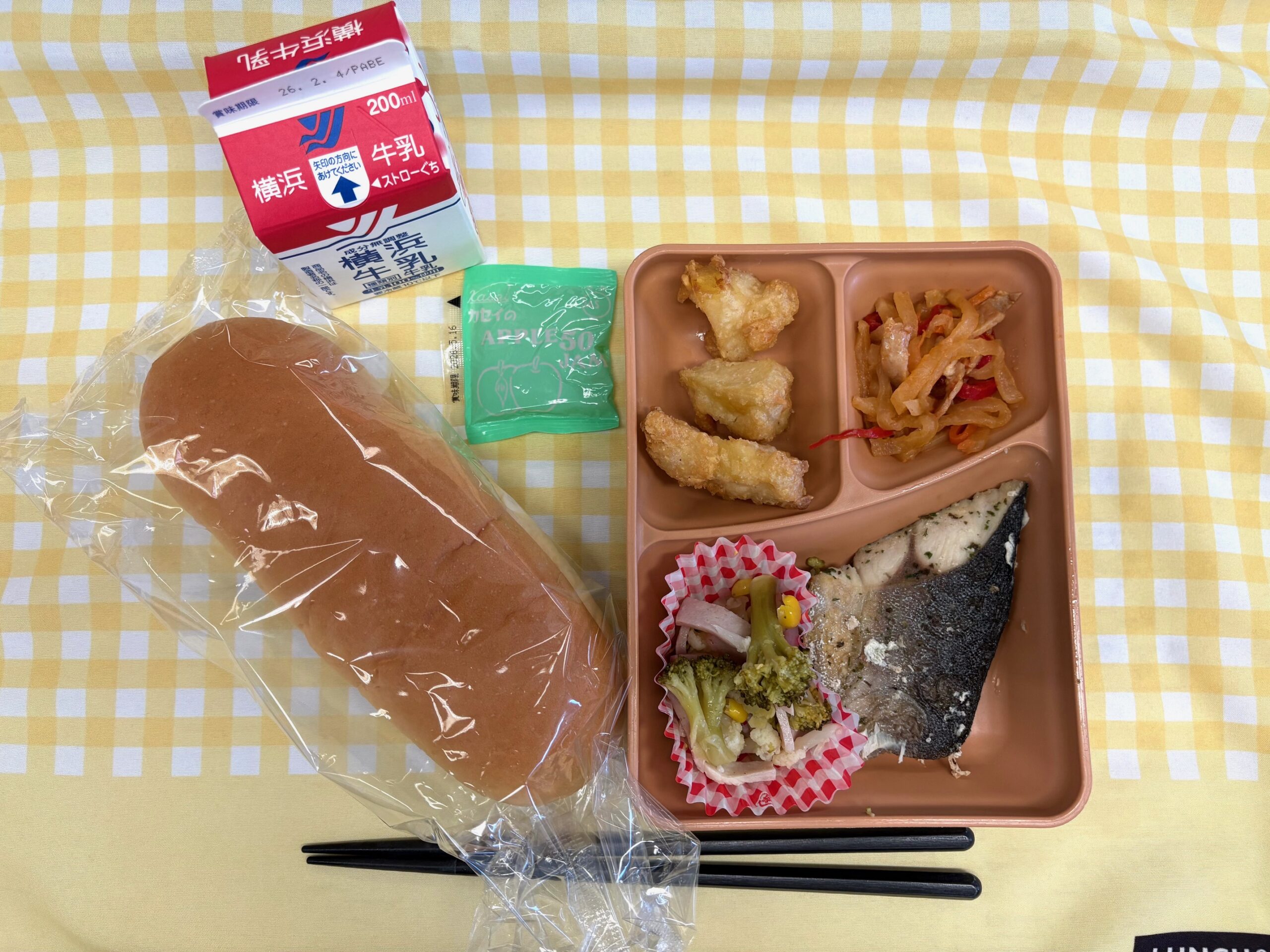 今日の給食は、コッペパン、しいらのジェノバソース、ホットサラダ、大根のイタリアンソテー、アーモンドポテトドック、りんごジャム、牛乳です。