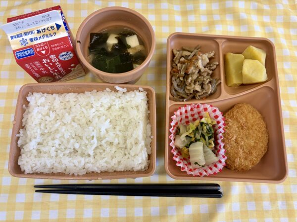 今日の給食は、ごはん、ぶりカツ、白菜の塩麹和え、さつまいものレモン煮、かわりきんぴら、みそ汁、牛乳です。