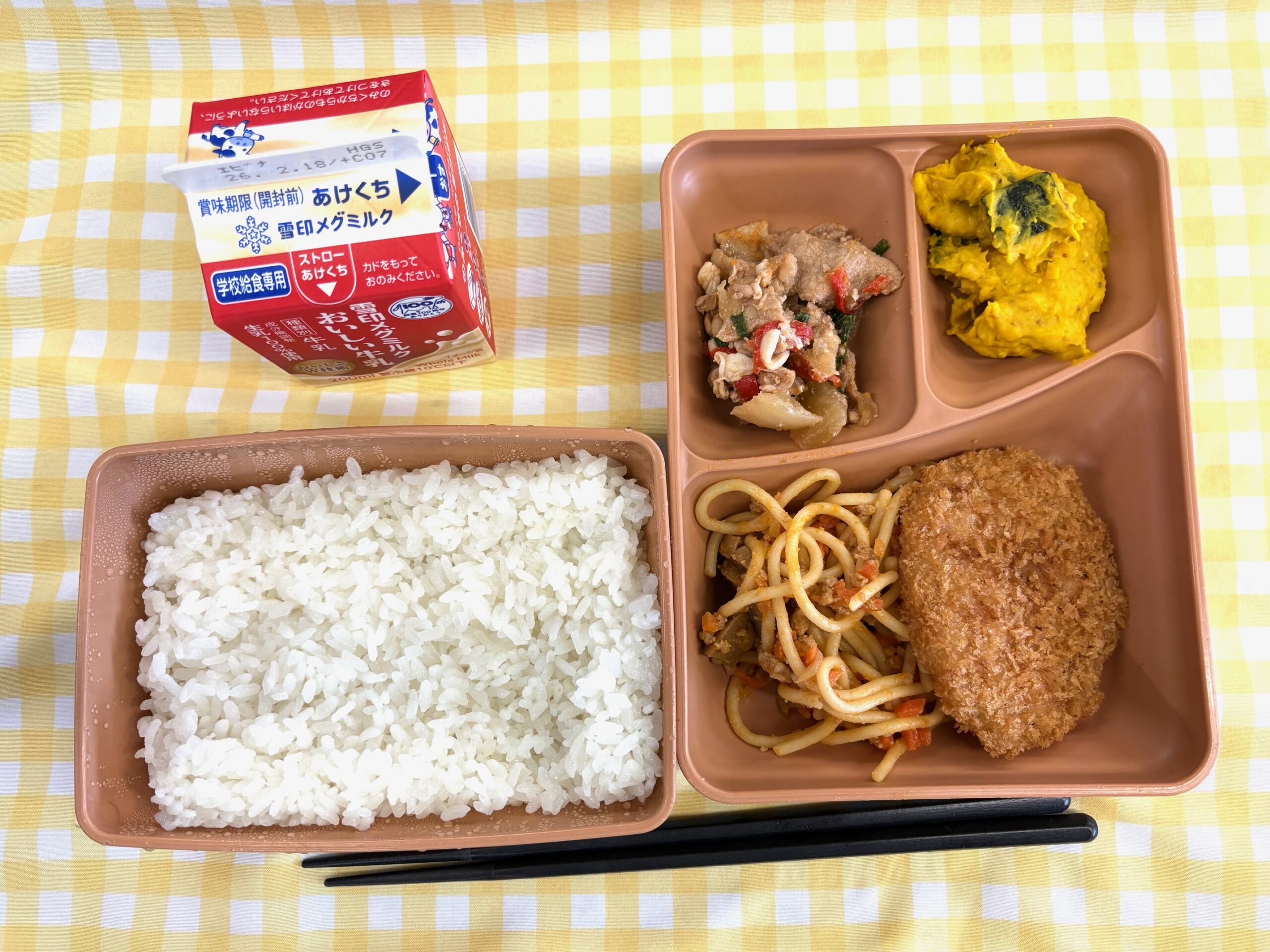 今日の給食は、牛乳、えびかつ、スパゲティミートソース、かぼちゃのサラダ、大根入りプルコギ、牛乳です。