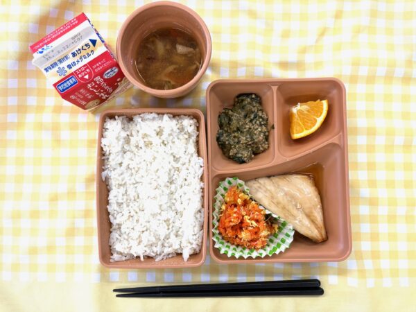 今日は、麦ごはん、ぶりの照り焼き、にんじんしりしり、青菜の肉みそ炒め、いよか、のっぺい汁です。