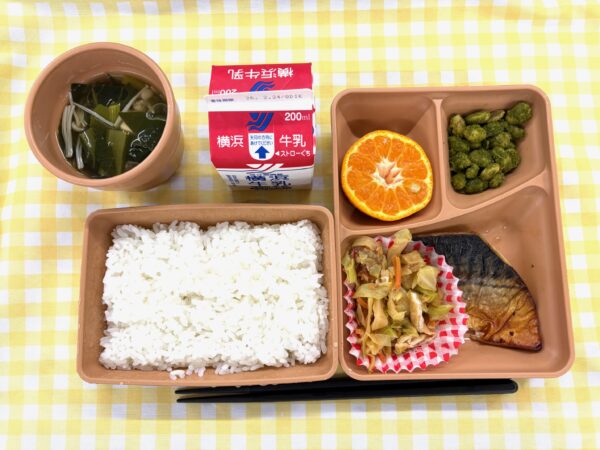 今日は、ごはん、鯖のゆずみそ焼き、キャベツのおかかあえ、お茶豆、ぽんかん 、すまし汁