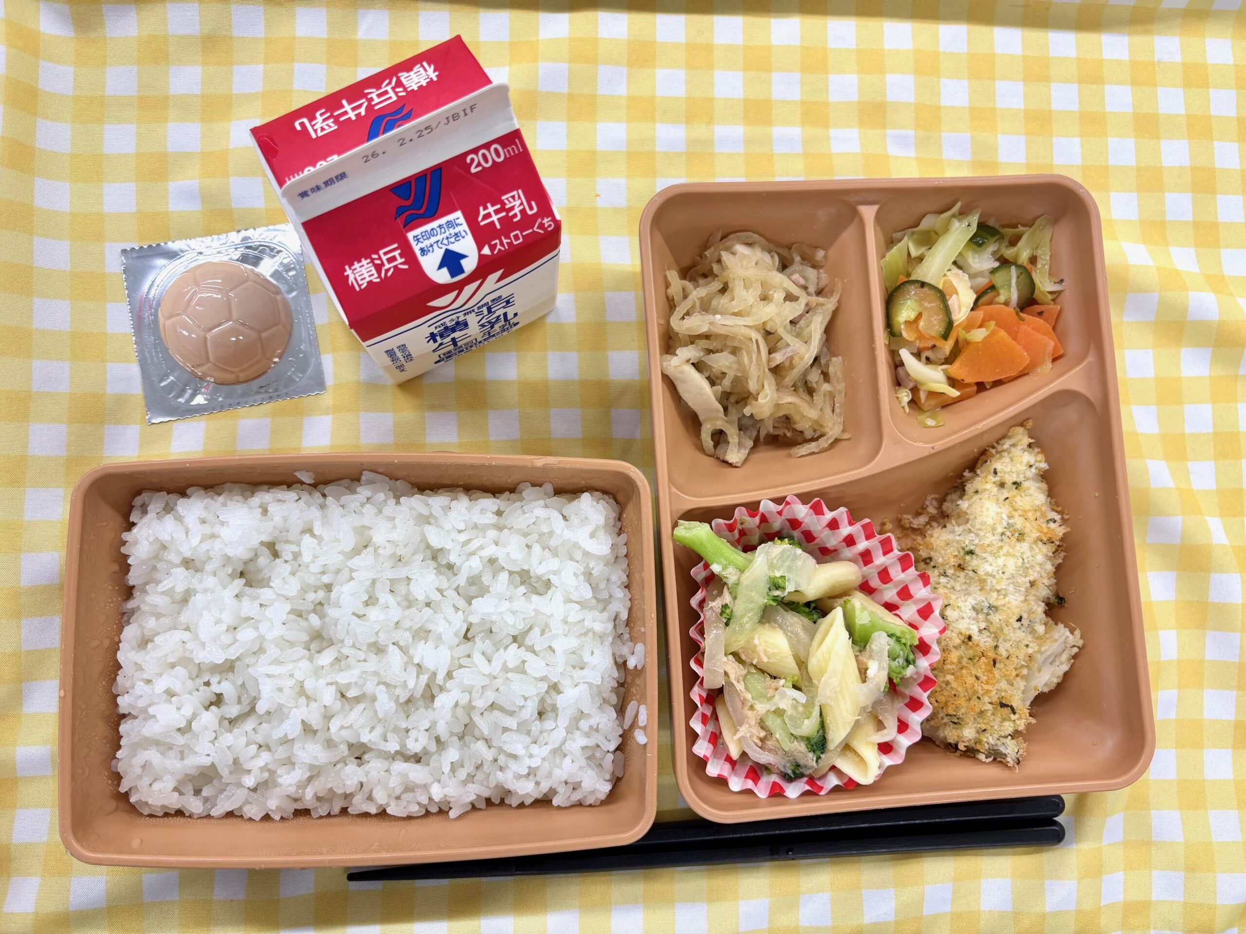 今日の給食は、ごはん、シチリア風パン粉焼き、ブロッコリーとツナのペンネ