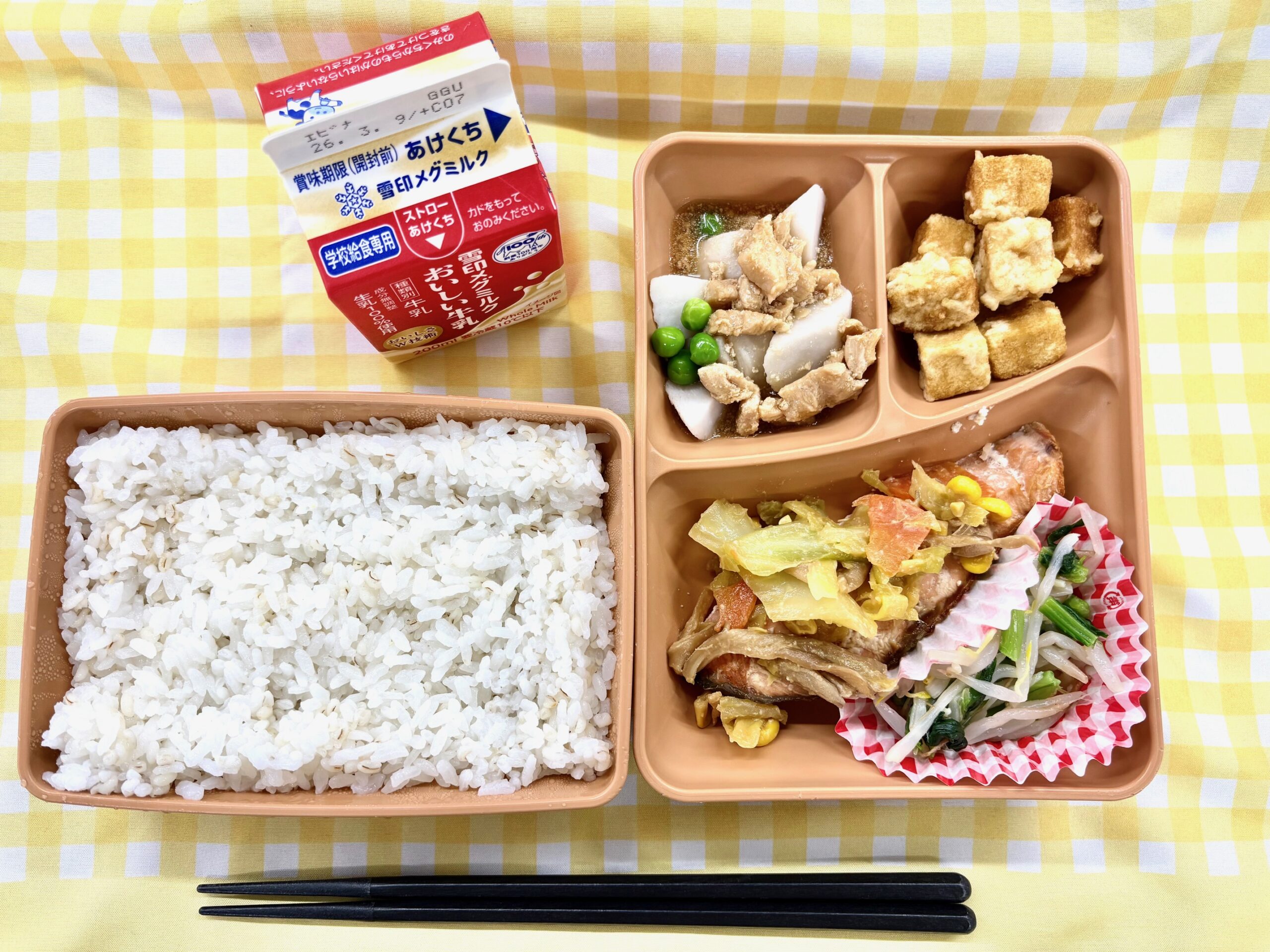 今日の給食は、麦ごはん、鮭のちゃんちゃん焼き、凍り豆腐のこはく揚げ、小松菜ともやしの塩炒め、里芋のあんかけ、牛乳です。