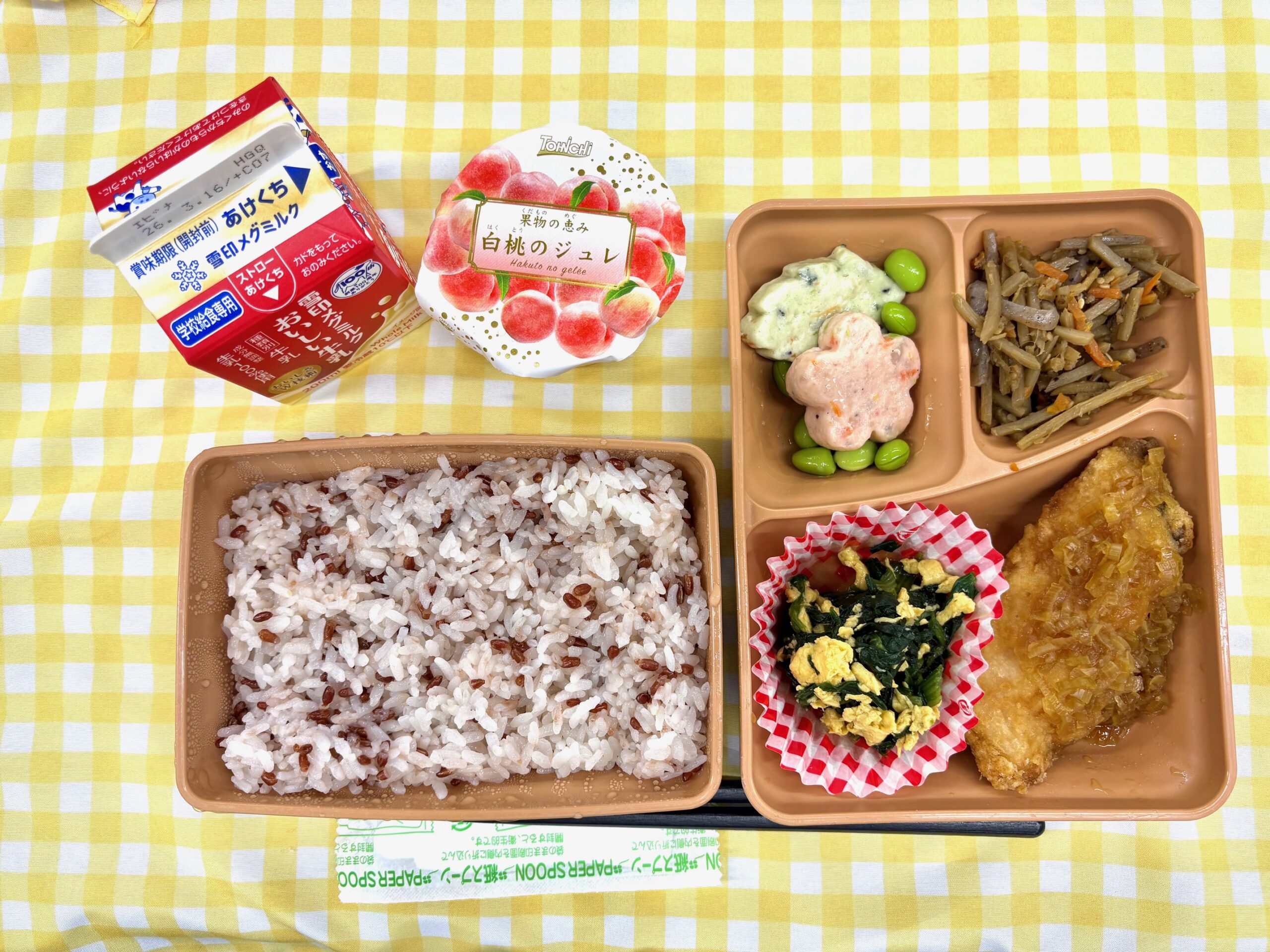 献立は赤米ごはん、鰆の香味揚げ、菜の花あえ、きんぴら(うど)、桜&葉っぱしんじょ、桃ゼリー、牛乳です。