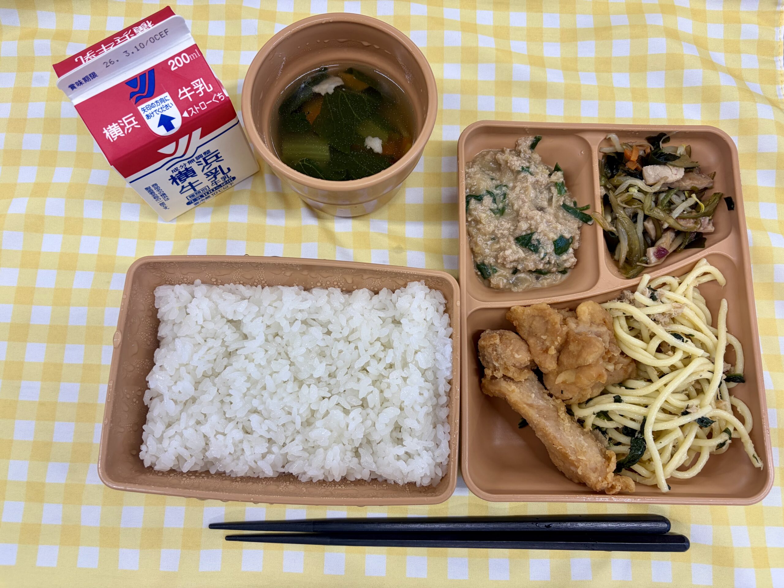 ごはん、バッファローチキン、ツナと青菜のペペロンチーノ、海藻サラダ、麻婆大根、野菜スープ、牛乳です。