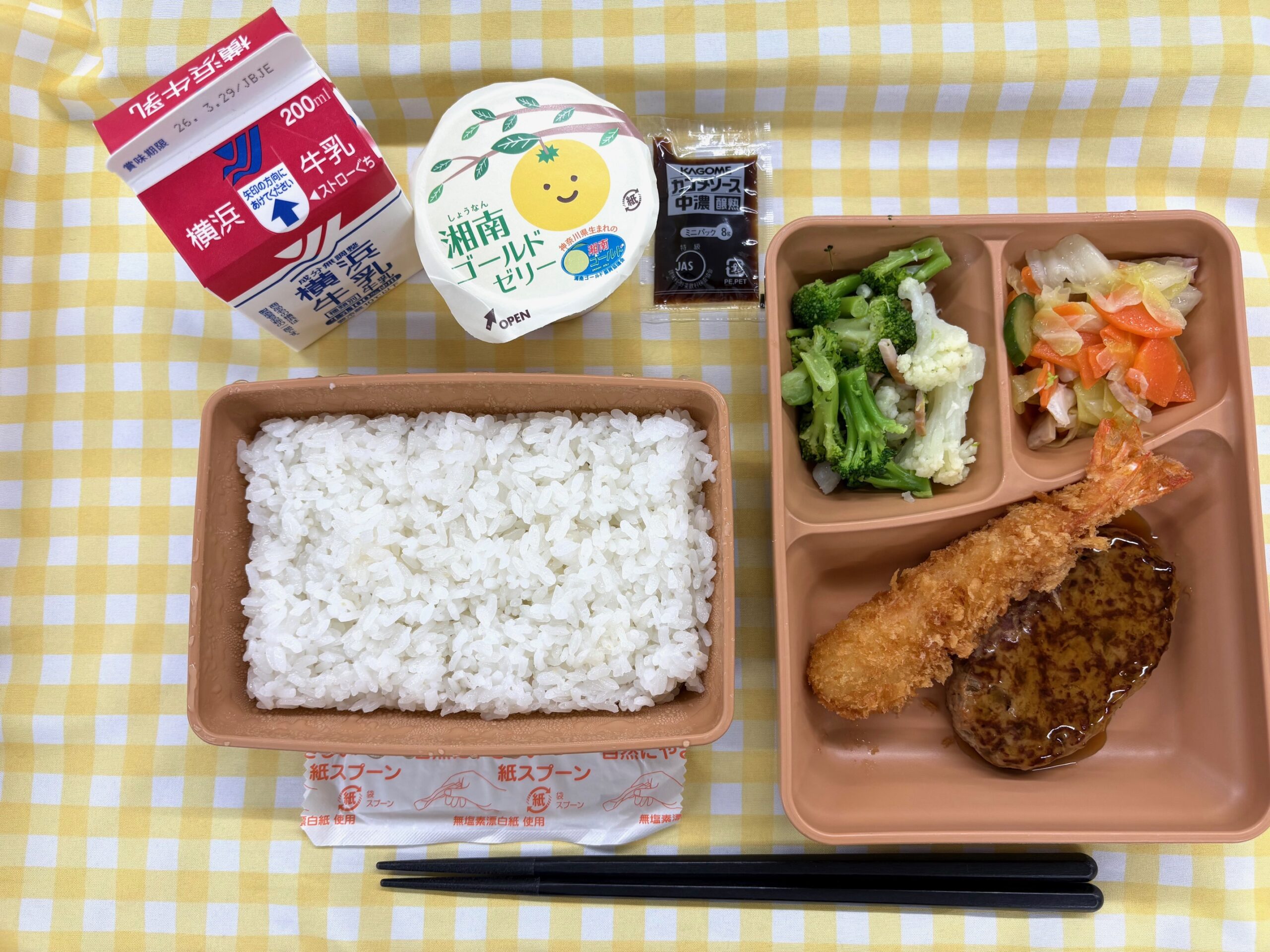 今日の給食は、ごはん、エビフライ、てりやきハンバーグ、フレンチサラダ、ブロッコリーのソテー、湘南ゴールドゼリー、牛乳です。
