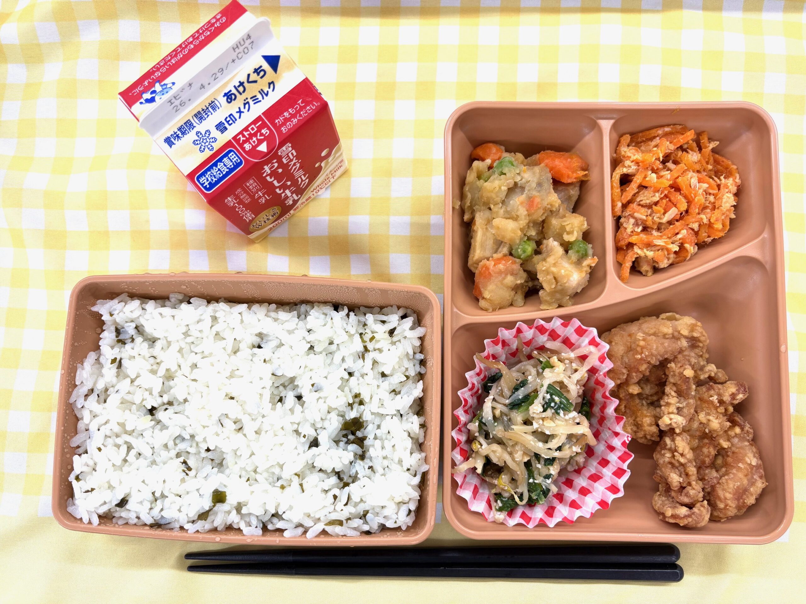 今日の給食は、わかめごはん、鶏肉のからあげ、アーモンドあえ、にんじんしりしり、新じゃがいもの煮つけ、牛乳です。