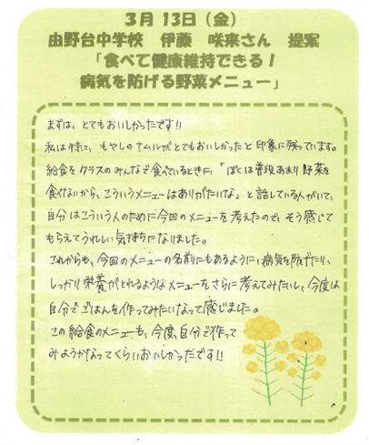 由野台中学校1年伊藤さんの提案献立が登場です。健康を維持できるように野菜を重視し、野菜が苦手な人も食べられるような献立を考えてくれました。野菜がたくさん使われていてビタミン豊富。たんぱく質やカルシウなど他の栄養も考えられた献立です。