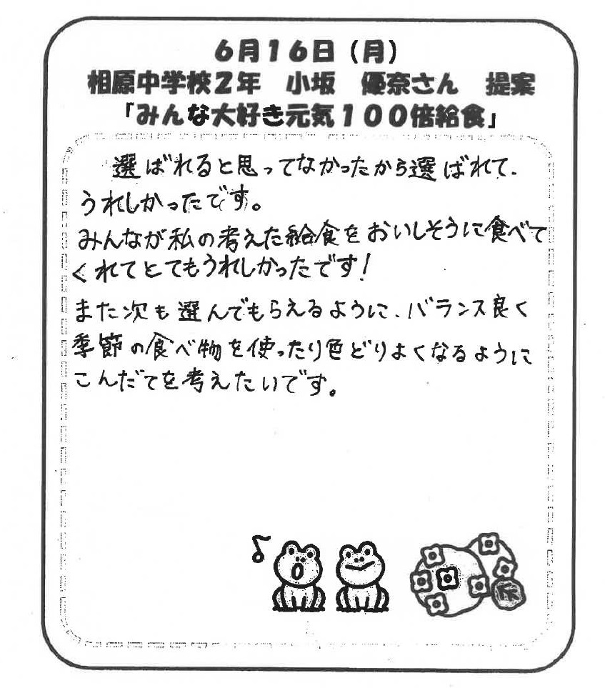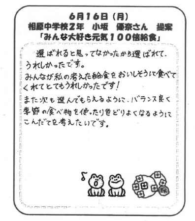 今日の給食は、ごはん、あじフライ、小松菜ともやしの煮びたし、えびと卵のサラダ、冬瓜と生揚げのピリ辛炒め、みそ汁、牛乳です。