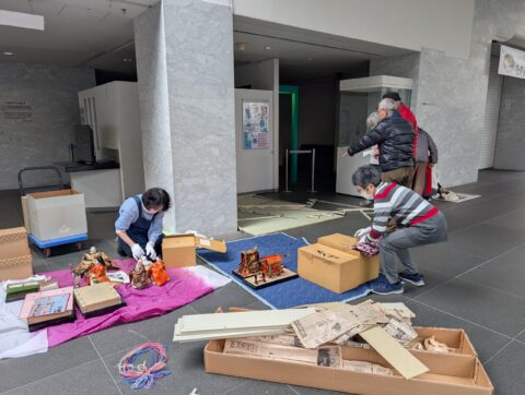 箱に収められた雛飾りを一つ一つ開梱しています。