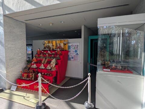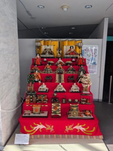 エントランスの情報サービスコーナー前では、2月19日(火)から3月8日(日)までの期間、市民学芸員が所蔵する七段飾りの雛人形と大正時代の雛人形を展示しています。